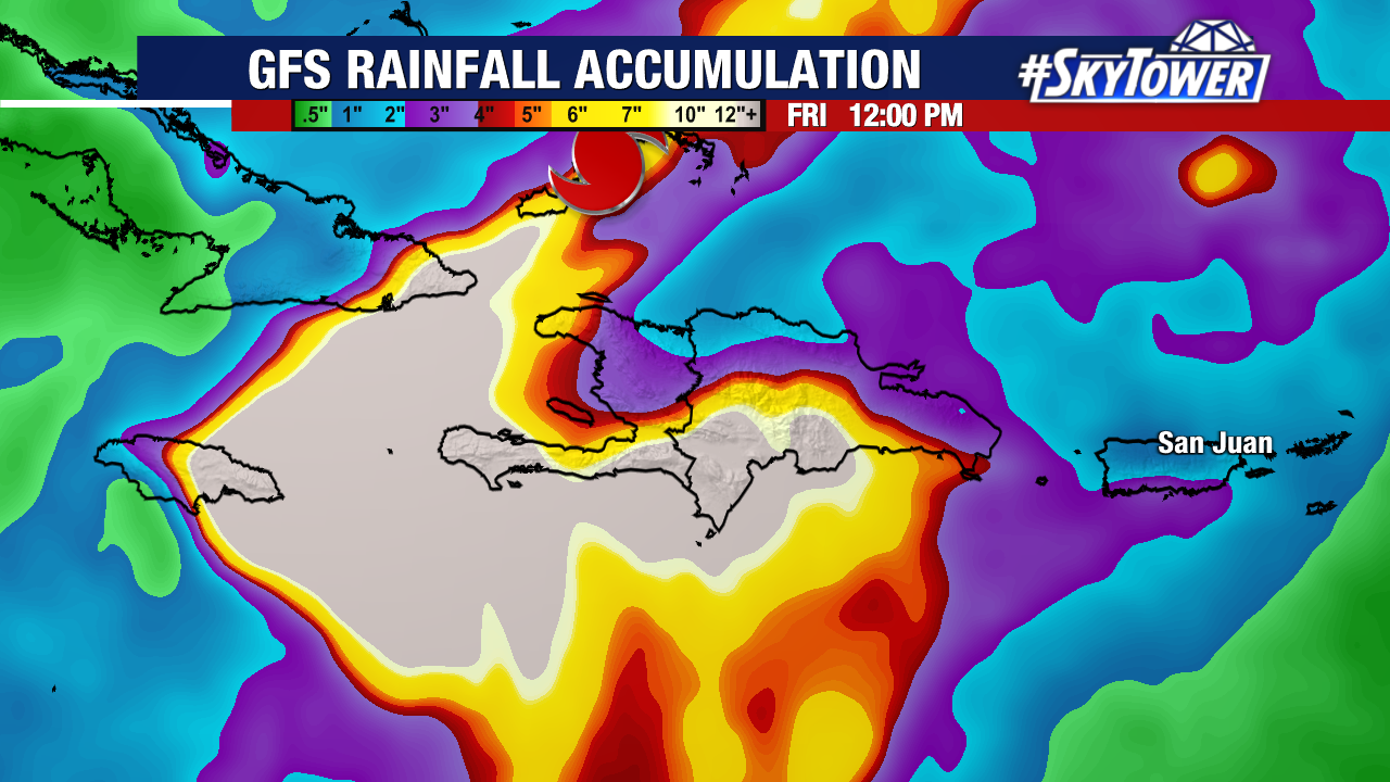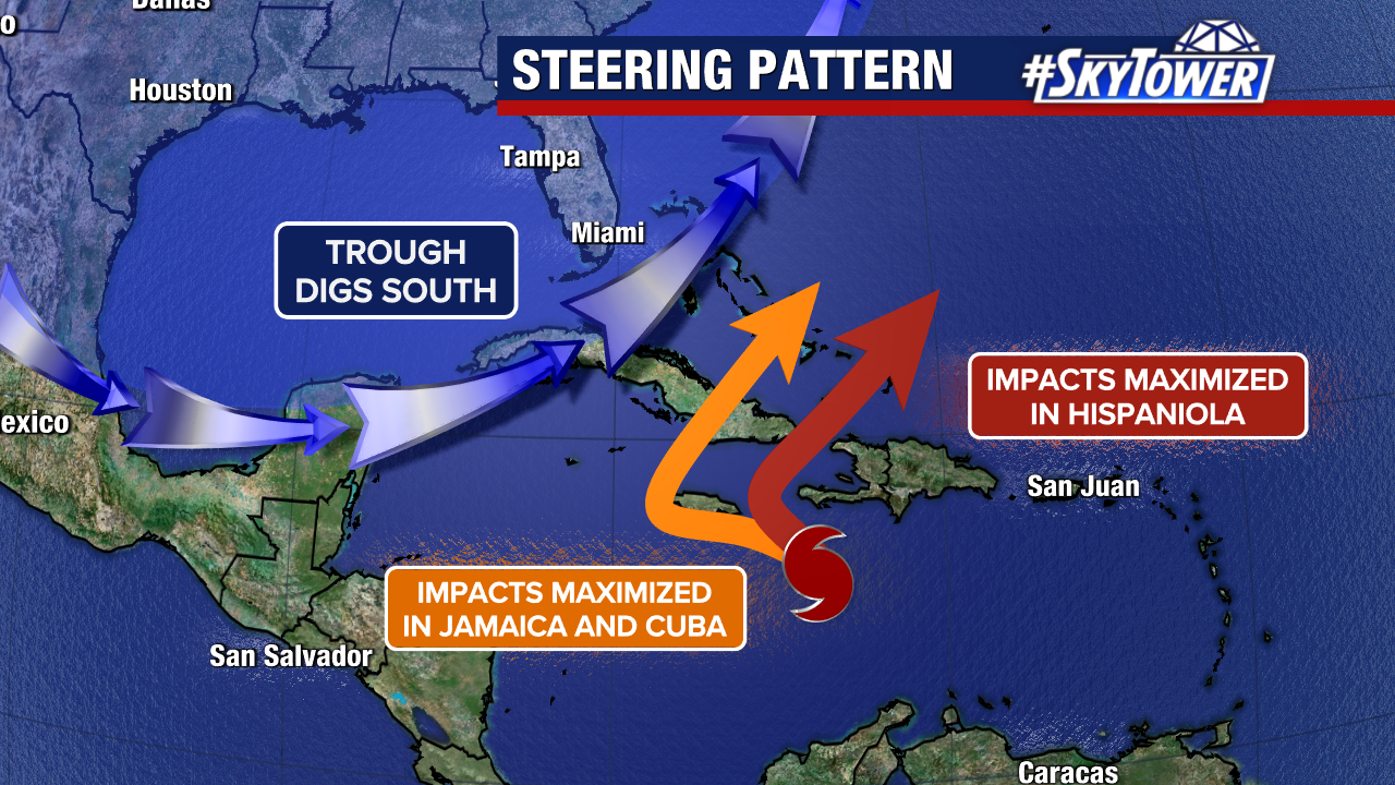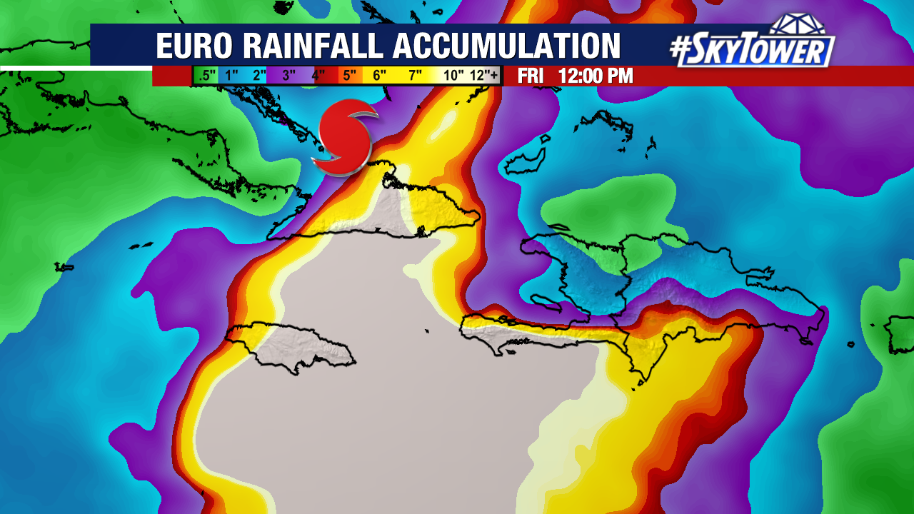 A track just east of Jamaica would likely bring the biggest rain-related impacts (potentially over 300 mm) to Hispaniola and eastern Jamaica.